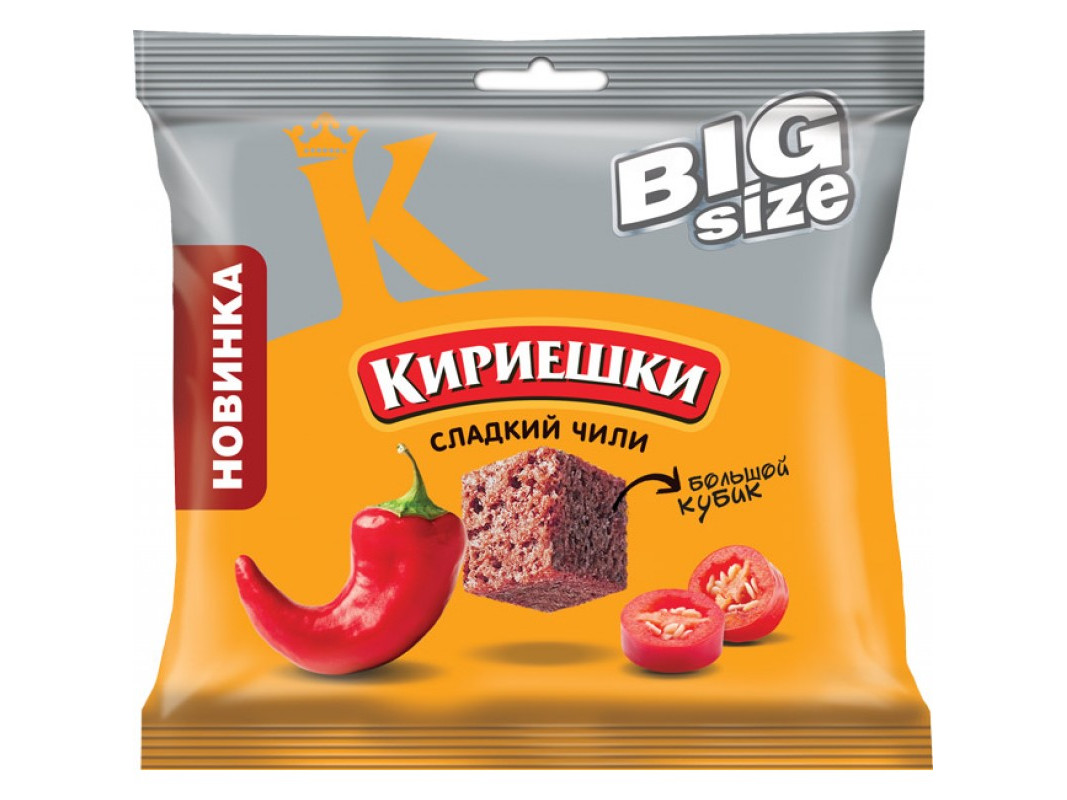 Сухарики «Кириешки Big Size» со вкусом сладкого чили — это хрустящие пшеничные кубики весом 80 г, приготовленные из свежеиспечённого хлеба без обжарки во фритюре. Они идеально подходят в качестве закуски к напиткам, супам или просто для перекуса.