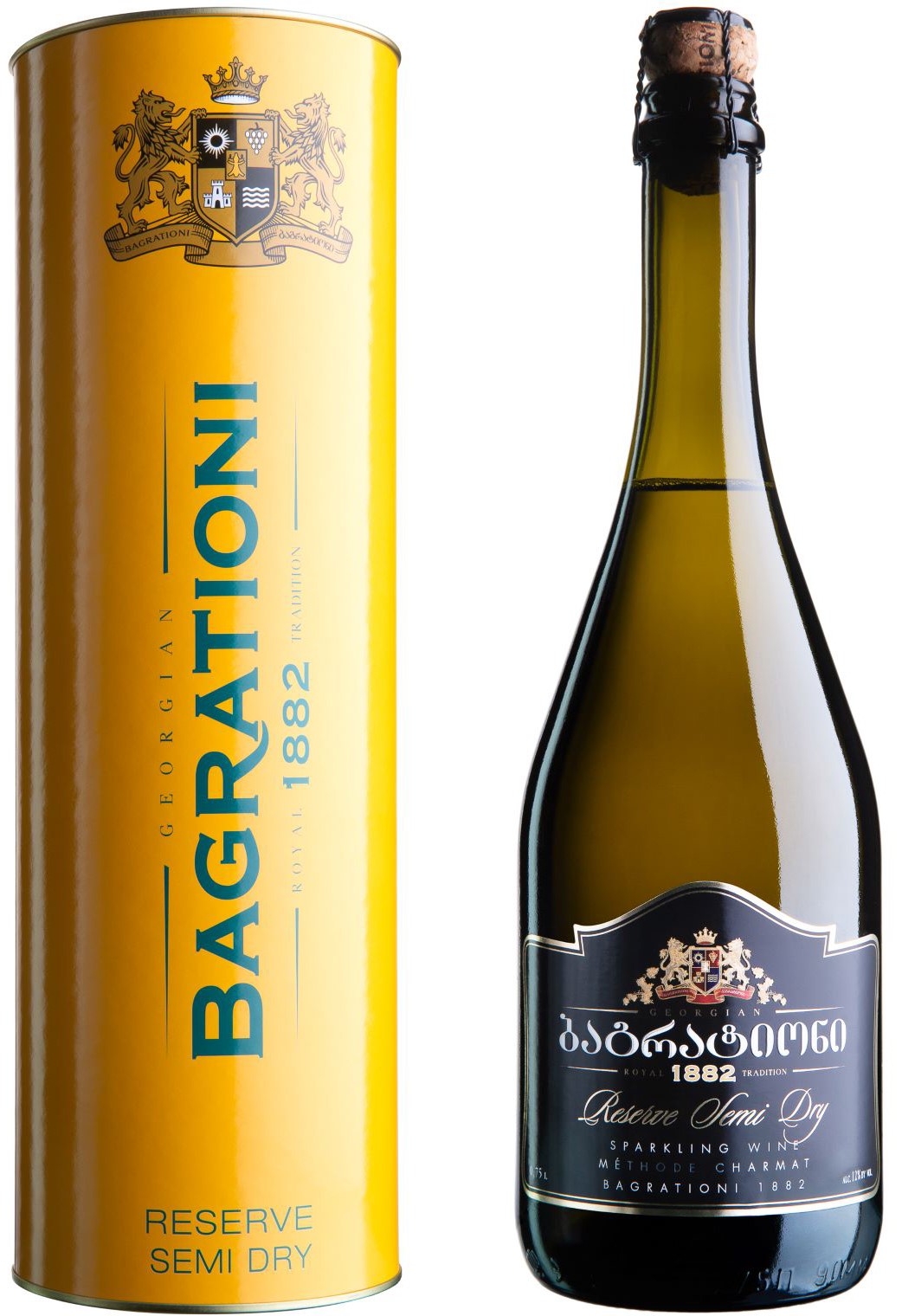 Вино игристое натуральное сухое "Багратиони Резерв Полусухое" изготовлено из отборного винограда традиционных сортов Чинури, Горули, Мцване и Тицка, выращенного в Грузии. Игристое вино, произведенное методом естественного брожения, время созревания мин. девять месяцев.