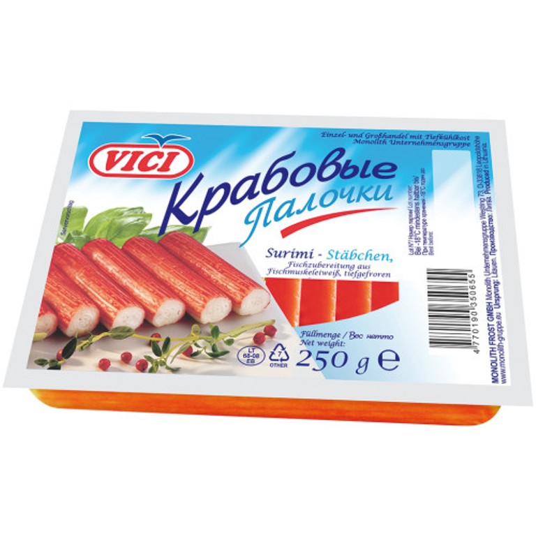 Složení: voda, surimi 28% (rybí maso, stabilizátory: E420, E450, E451, E452, cukr), vaječný bílek, škrob, řepkový olej, sójový protein, cukr, sůl, krabová příchuť( obsahuje korýše, zvýrazňovače chuti a aroma: E635), ochucovadlo, žloutek, barviva: E171, E120, E160c, stabilizátor: karagenan.