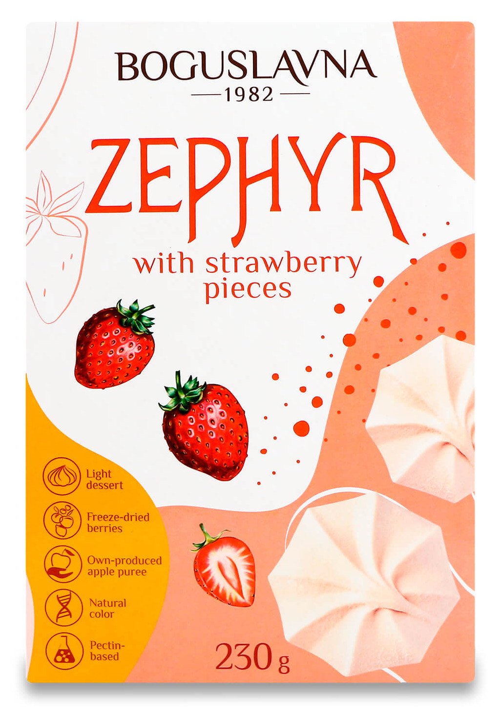 Зефир с кусочками клубники 230 г Богуславна — это воздушное и нежное лакомство, которое сочетает в себе легкость зефира и натуральный вкус клубники.