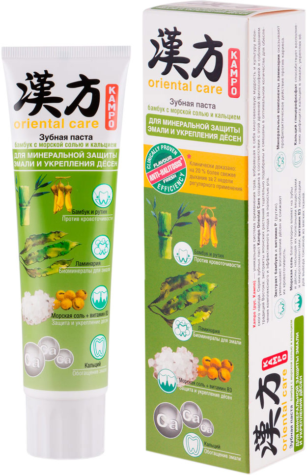Уникальная система применения трав, вобравшая в себя многовековую мудрость и культуру японского народа. Серия зубных паст Kampo Oriental Care создана в соответствии с этой древней философией и соблюдением традиций Востока: экстракты японских растений тщательно подобраны и смешаны в оптимальном количестве для обеспечения комплексного и эффективного ухода за полостью рта. Экстракт бамбука и витамин Р уменьшают воспаление дёсен и снижают их кровоточивость. Минеральные компоненты ламинарии оказывают профилактическое действие против кариеса. Морская соль благотворно влияет на зубы и дёсны, насыщая их полезными веществами и микроэлементами, витамин В3 необходим для вывода токсинов из мягких тканей. Кальций глицерофосфат способствует восполнению дефицита кальция в эмали, укрепляя её.